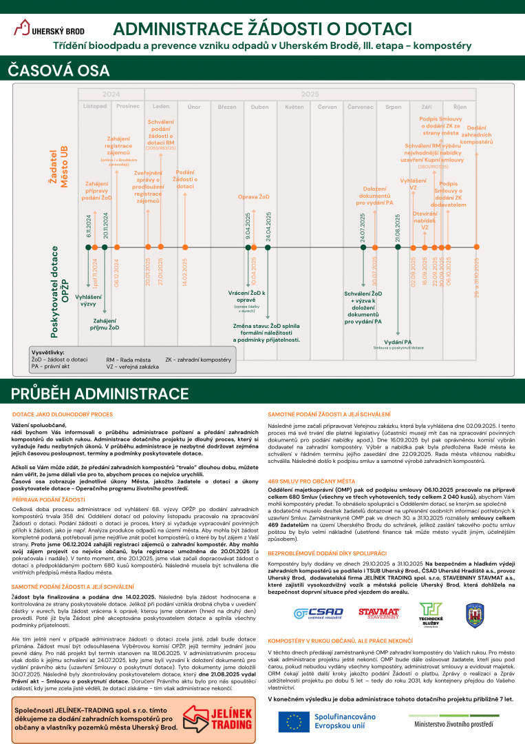 Dne 14.02.2025 podalo město Žádost o poskytnutí dotace na pořízení zahradních kompostérů v rámci 68. výzvy Operačního programu životní prostředí. Celková výše dotace z příspěvku Evropské unie na základě Rozhodnutí o posyktnutí dotace činí 819.780,50 Kč. V měsíci říjnu byla uzavřena smlouva s dodavatelem JELÍNEK TRADING spol. s.r.o. a dodány 29. a 31.10.2025. Kompostéry budou předány do rukou občanů města na začátku měsíce listopadu 2026.