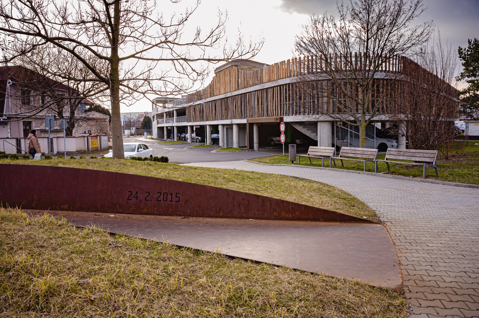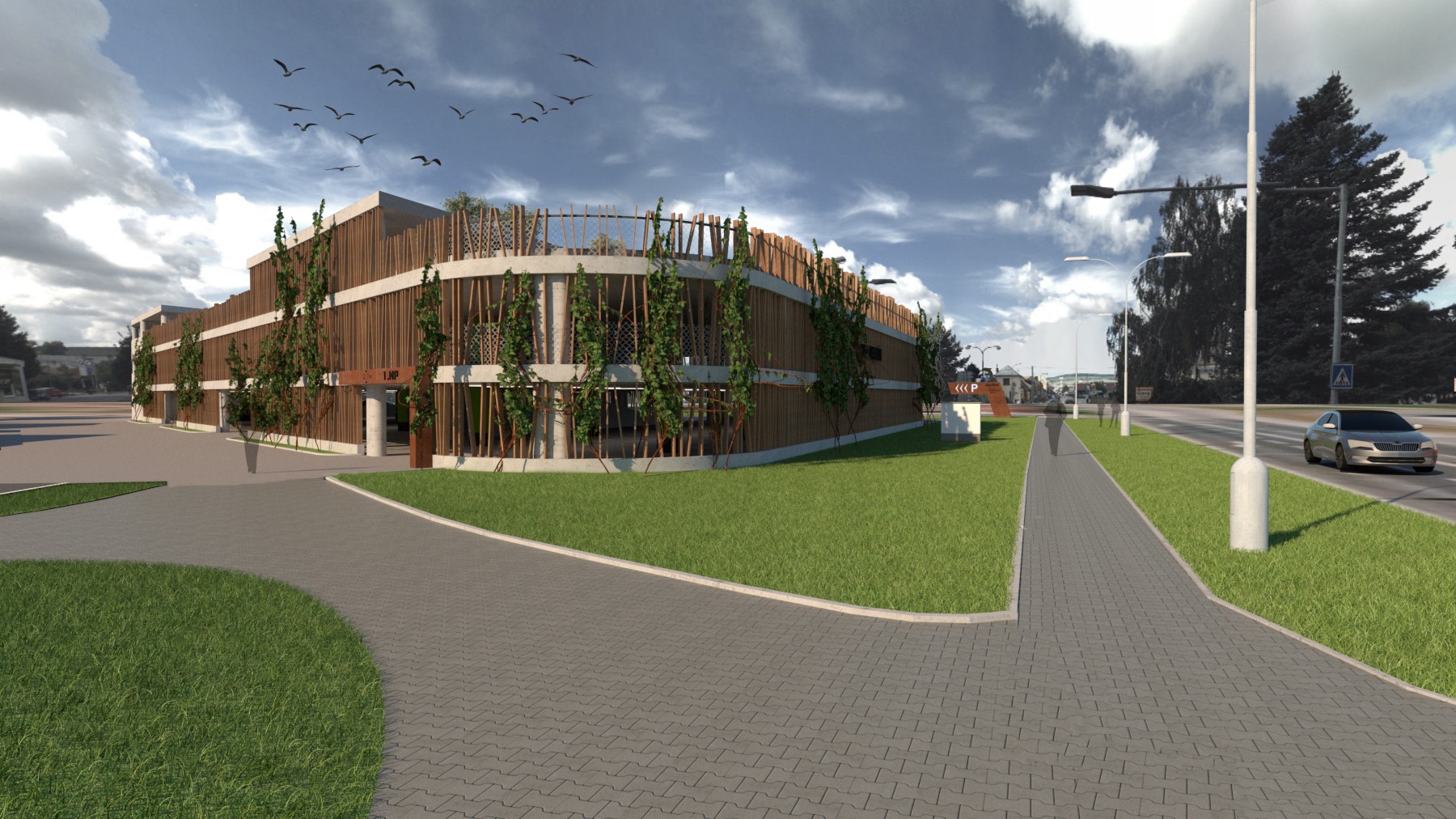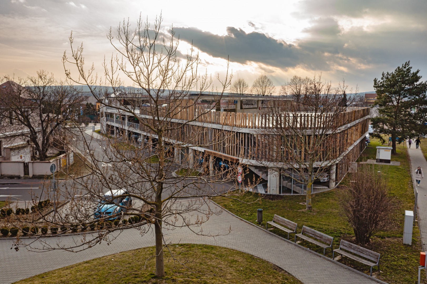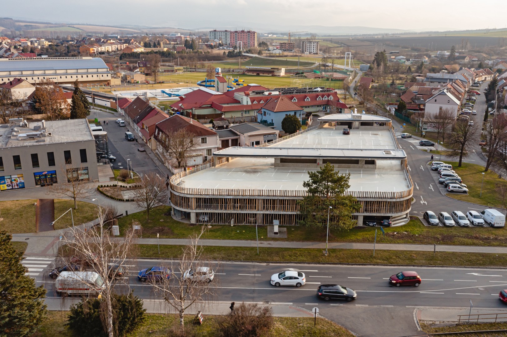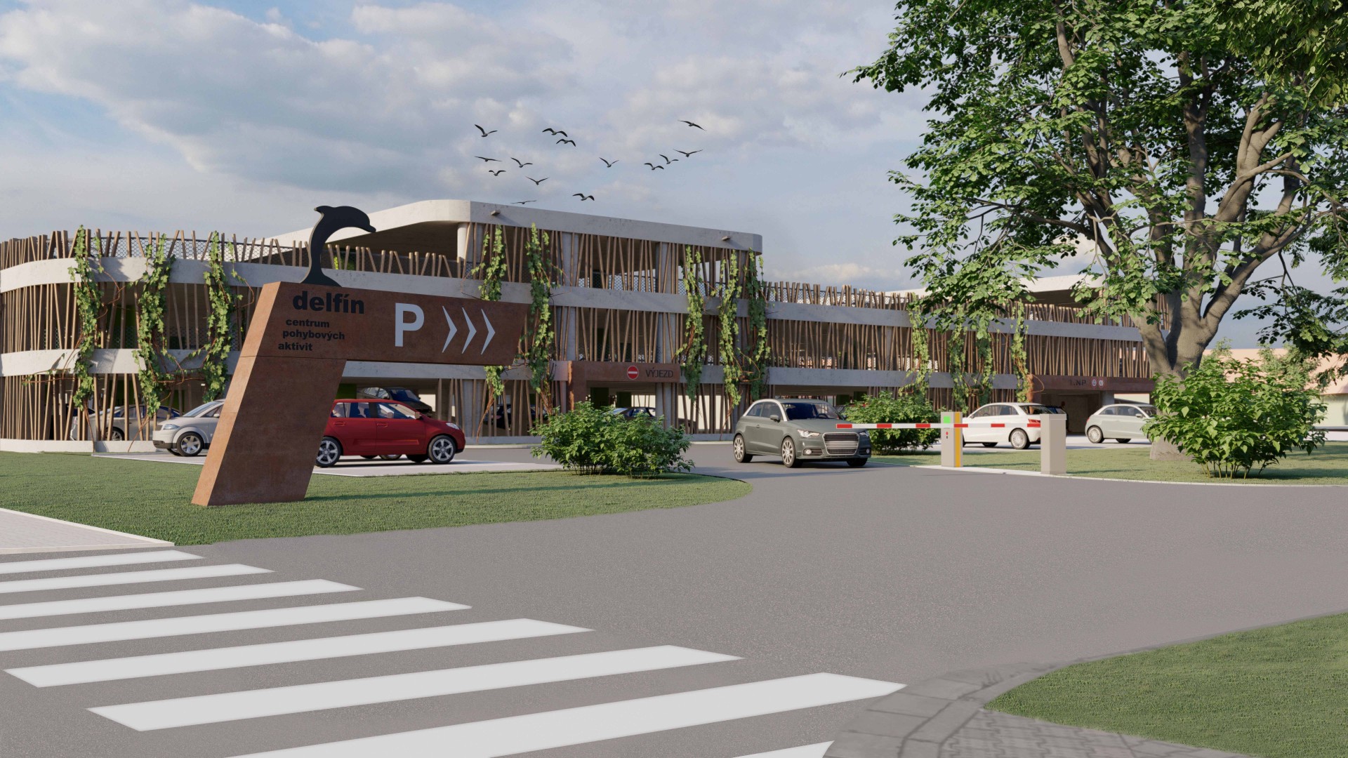 Roku 2022 byl dokončen třípatrový parkovací dům u Centra pohybových aktivit Delfín. Jedná se o třípodlažní nepodsklepený objekt, který je otevřený a nemá pravidelný půdorysný tvar. Vzjezd na střechy je částečně zastřešen a podlaží jsou propojena rampami, kdy jedna z nich je přímá a druhá kruhová. Hlavní příjezd k objektu je z ulice Vlčnovská a vedlejší z ulice Sokolovská. Parkoviště je označeno informační tabulí. Vedle parkovacího domu jsou umístěna další dvě nekrytá parkoviště. V objektu je umožněno parkování osobních automobilů ve třech úrovních – v 1. NP, 2. NP a na částečně kryté střeše. Pod sjezdovou rampou je umístěn uzavřený prostor, který je určen pro dobíjení elektromobilů. Východ z jednotlivých podlaží k areálu aquaparku je možný také po schodišti, které je umístěno ve středu příjezdové kruhové rampy a v rámci kterého bude také osazen výtah.